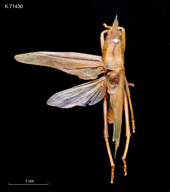 The Mimicking Snout-nosed Katydid can be green or brown, and lives among various grasses. It has strong mandibles for cracking grass seeds and, if carelessly handled, can give a nasty bite.