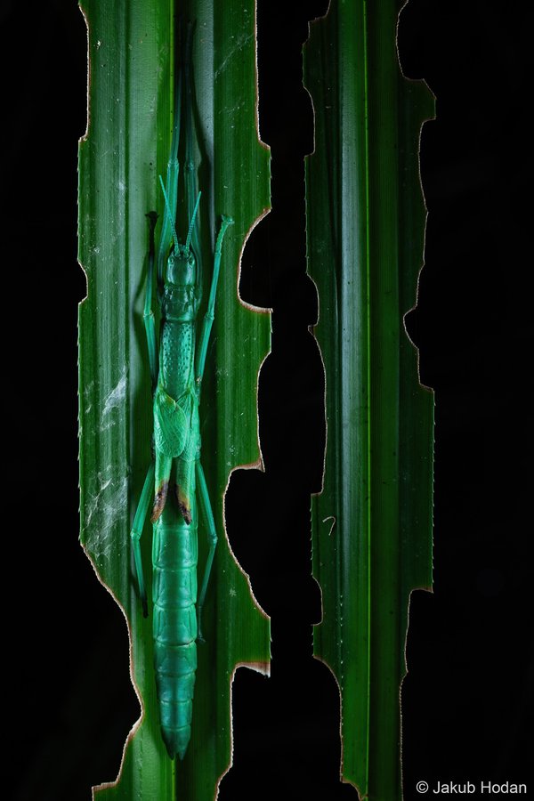 Peppermint stick insects are great at camouflaging themselves. Wedged in the slide-shaped Pandanus, they can quickly escape into the denser centre and be hard to photograph. To make the photo more interesting, I used an in-body double exposure of the main subject (left) and the end part of the same leaf (right).