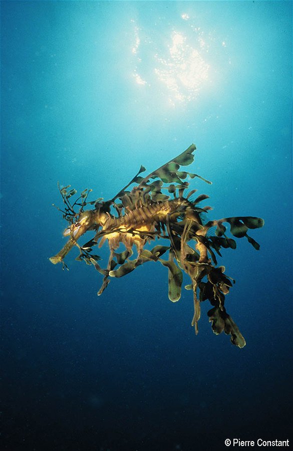 This photograph, taken off Kangaroo Island, South Australia, reveals the magic golden sheen of the elusive leafy sea dragon (Phycodurus eques) in the sea light.